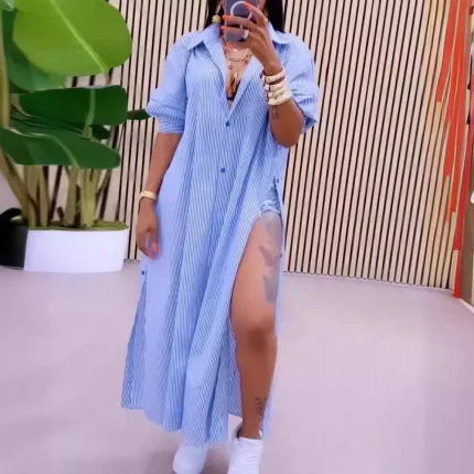 Women Fashion Casual Stripe Lapel Long Sleeve Split Long Blouse