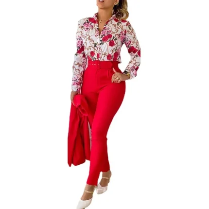 Women Fashion Casual Floral Printed Lapel Long-Sleeve Blouse Slim Fit Pants Two-Piece Pants