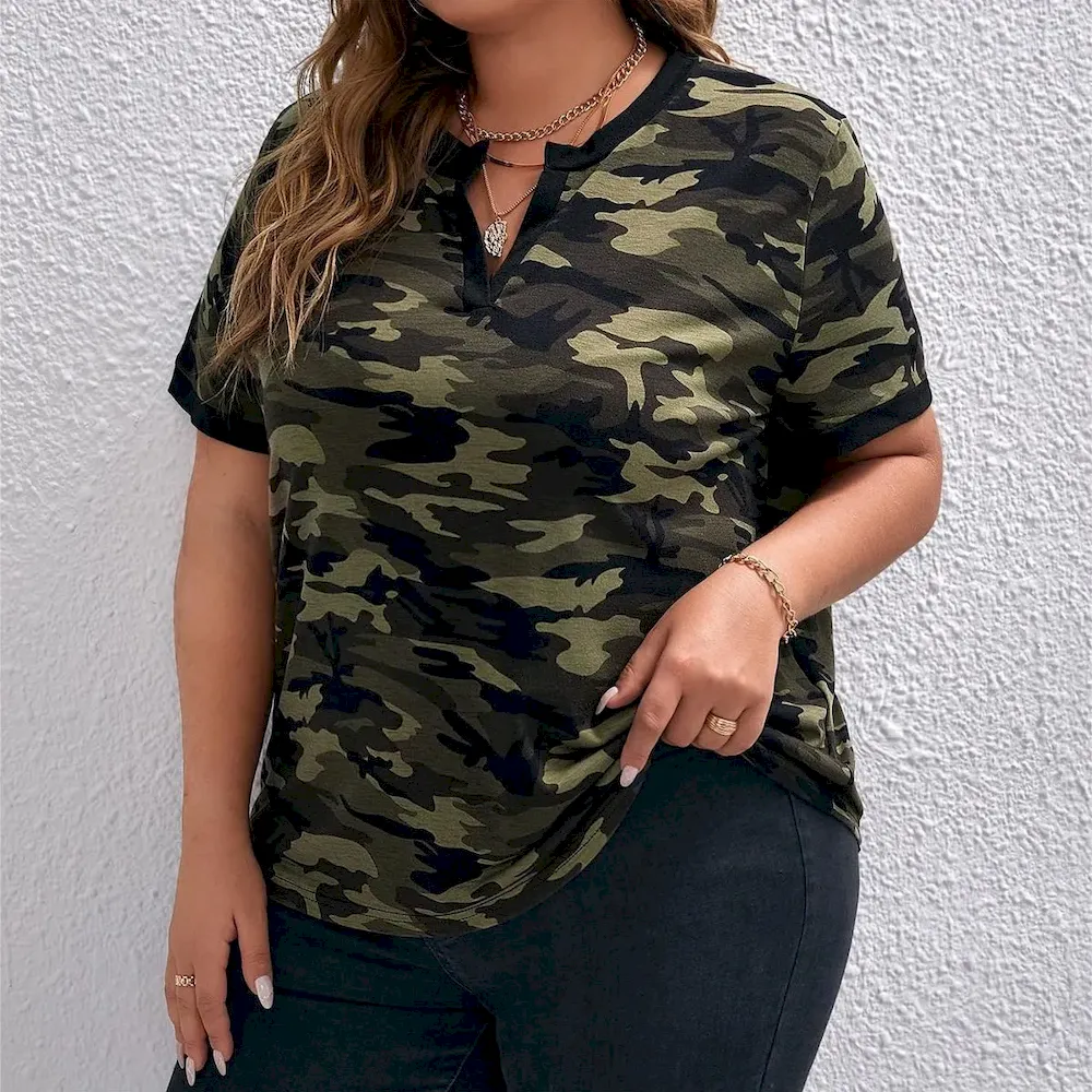 Women Casual Camouflage Plus Size V-Neck Short-Sleeve T-Shirt